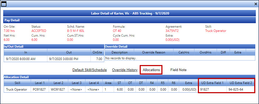 If the Show Allocation Page Extra Fields setting is used, then the information for the Extra Fields are displayed in the Labor Details dialog box for Authorization Central and Express Central.
