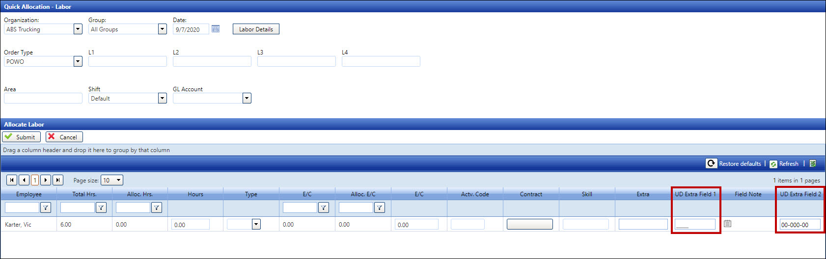 the Quick Allocation - Labor screen, the Extra Fields are displayed